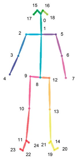 The detection of the body joints in each frame of the recording was calculated using the deep learning algorithm OpenPose [], which includes the 2D position related to the video and a confidence level for each joint identification between 0 and 1. The skeleton (Figure 3) includes 25 joints that can be divided into different parts of the body: head (0 nose, 15/16 eyes and 17/18 ears), trunk (1 neck and 8 mid hip), arms (2/5 shoulders, 3/6 elbows and 4/7 wrists), legs (9/12 hips, 10/13 knees, 11/14 ankles), and feet (19/22 big toes, 20/23 small toes and 21/24 heels). After detecting the skeleton, the 3D position of each joint during the experiment was obtained using the depth information of the camera. A computer with an Nvidia GTX1060 graphics card with the NVIDIA Pascal architecture capable of executing neural networks very efficiently in a compact size was used.