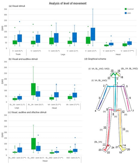 Analysis of the level of movement of joints that presents statistical differences: (a) Boxplot of joints in visual stimuli; (b) boxplot of joints in visual and auditory stimuli; (c) boxplot of joints in visual, auditory, and olfactory stimuli; (d) scheme of the joints including the stimuli where differences are found. Note. * p < 0.05. ** p < 0.01. *** p < 0.001.