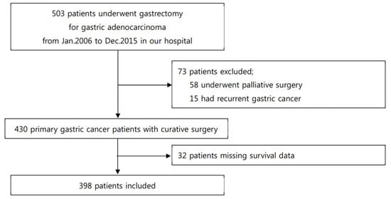 We included consecutive primary gastric adenocarcinoma patients who underwent subtotal or total gastrectomy from January 2006 to December 2015 using our registry at the Kangdong Sacred Heart Hospital. The inclusion criteria for this study were as follows: (1) primary gastric adenocarcinoma treated with curative gastrectomy and standard lymph node dissection, (2) survival data available. The exclusion criteria were as follows: (1) recurrent gastric cancer, (2) underwent palliative surgery, (3) history of other cancers within five years before or after gastric cancer diagnosis. Of 503 consecutively enrolled patients, 58 underwent palliative surgery and 15 underwent surgery due to recurrent gastric cancer. Survival data was unavailable for 32 patients. Thus, 105 patients were excluded, and a total of 398 patients were included in this study (Figure 1). None of the patients received chemotherapy preoperatively.