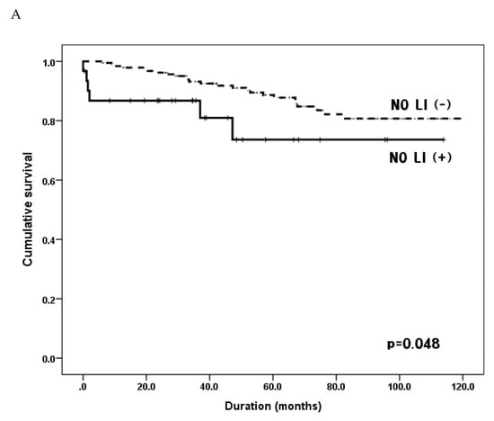 When we compared 5YSRs according to LI status in each N stage group, the LI-positive subgroup had a poorer prognosis than did the LI-negative subgroup in N0 (5YSRs, 87.8% vs. 73.6%, p = 0.048) and N1 (5YSRs, 87.2% vs. 50%, p = 0.007) stages. However, there were no survival differences between subgroups in N2 and N3 stages (Figure 3).
