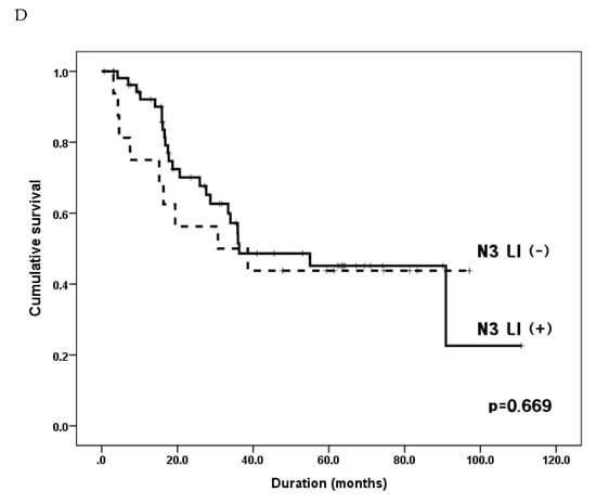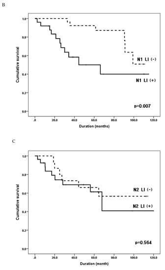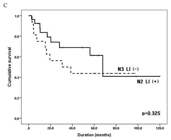 To analyze the effect of LI on N stage, we compared survival rates between LI-positive patients at each N stage and LI-negative patients at a one-higher N stage. Survival curves showed that the 5YSR of N0 patients with LI (N0 LI (+) subgroup) was not different from that of N1 patients without LI (N1 LI (−) subgroup) (73.6% vs. 87.2% of 5YSRs, p = 0.366) (Figure 4A). The 5YSR of the N2 LI (−) subgroup tended to be slightly better than that of the N1 LI (+) subgroup, though there was no statistically significant difference between the two groups (66.0% vs. 50.0%, p = 0.352, Figure 4B). There was no statistical difference in survival rates between N2 LI (+) and N3 LI (−) subgroups (61.3% vs. 43.8%, p = 0.325, Figure 4C).