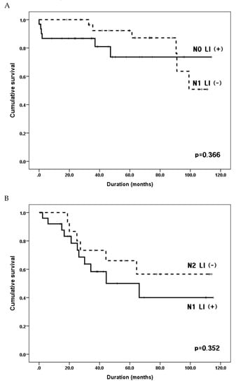 Next, we compared survival rates of patients with and without LI in the same N stage, and then compared the survival rates of patients showing LI with those at a higher N stage without LI, to assess the effect of LI on survival. Surprisingly, the 5YSR of patients with LI was similar to that of patients without LI in the one-higher N stage group (N0 with LI vs. N1 without LI (p = 0.366), N1 with LI vs. N2 without LI (p = 0.352), N2 with LI vs. N3 without LI (p = 0.325)). These results suggest that each N stage patient with LI has a poor prognosis similar to one-step higher N stage patients without LI. One previous study reported that the 5YSR was similar between EGC patients without lymph node metastasis (T1N0M0) with LI, and those with lymph node metastasis (T1N1M0) without LI []. Thus, the current AJCC staging system may not reflect precise prognosis because this classification does not consider LI status. It might be necessary to account for LI in the current staging system and treat the presence of LI as an upstaging factor of N stage. Furthermore, LI status can be a decision-making factor for extensive dissection of perigastric lymph node or additional chemotherapy after surgery in early N stage patients. Appropriate treatment selection according to tumor status is essential to improve patient survival. Some studies have concluded that node-negative EGCs with LI are associated with poor prognosis and higher risk of recurrence than those without LI and, thus, should receive additional therapy after initial surgery [,,,].