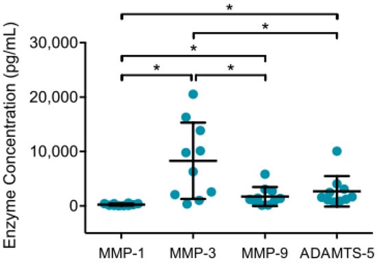 MMP and ADAMTS production in supernatant of synovial cell cultures are displayed. After enzymatic digestion of synovial membrane from patients with advanced knee OA, native synovial cells were cultured for 12 h at 37 °C and 5% CO2. Enzyme linked immunosorbent assays were then used to analyze enzyme production in culture supernatants. Mean and standard deviation of enzyme concentrations of MMP-1/-3/-9 and ADAMTS-5 are plotted (n = 12). Significant differences are indicated by asterisks: * p < 0.05. In addition, production of MMP-13, ADAMTS-5 and ADAMTS-7 were analyzed, but concentrations were below detection level.