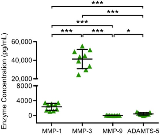 To determine catabolic chondrocyte activity, MMP and ADAMTS concentrations in supernatants of chondrocyte monocultures were analyzed by ELISA after 48 h of incubation (Figure 2). All analyzed enzymes (MMP-1, MMP-3, MMP-9 and ADAMTS-5) were detected. MMP-3 was the most highly enriched enzyme with a significantly higher concentration than MMP-1, MMP-9 and ADAMTS-5, while MMP-9 was detected with the lowest concentration, which was significantly lower than the concentration of MMP-1, MMP-3 and ADAMTS-5.