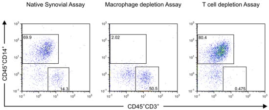 Flow cytometry analyses of synovial membrane from a representative patient with advanced knee OA before and after mononuclear cell depletion are shown. Synovial membrane was enzymatically digested and depletion of CD14+ and CD3+ cells were performed using magnetic activated cell sorting. Samples of native synovial assay and depletion assays were stained with R-phycoerythrin (PE)-conjugated antibodies against CD45 (Clone: 5B1), fluorescein isothiocyanate (FITC)-conjugated antibodies against CD14 (Clone: M5E2), Allophycocyanin (APC)-conjugated antibodies against CD3 (Clone: HIT3a) and 7-aminoactinomycin D (7-AAD). Alive cells were gated based on their forward-/side-scatter (FSC) profile and their affinity to 7-AAD. Dead cells and cell debris were excluded. Then mononuclear cells were defined by their FSC profile and their surface marker expression as CD45+CD14+ macrophages and CD45+CD3+ T cells. The effective depletion of synovial macrophages and T cells is shown.