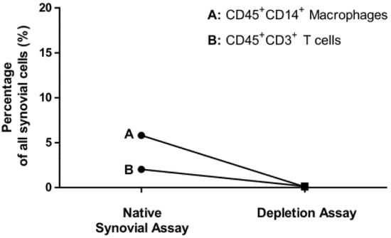Depletion of synovial macrophages and T cells shown by flow cytometry analyses. Display of the mean values of: Percentage of CD45+CD14+ macrophages (A) and CD45+CD3+ T cells (B) on all living synovial cells in the samples of the native synovial assays and macrophages (n = 10) and T cell depletion assays (n = 12).