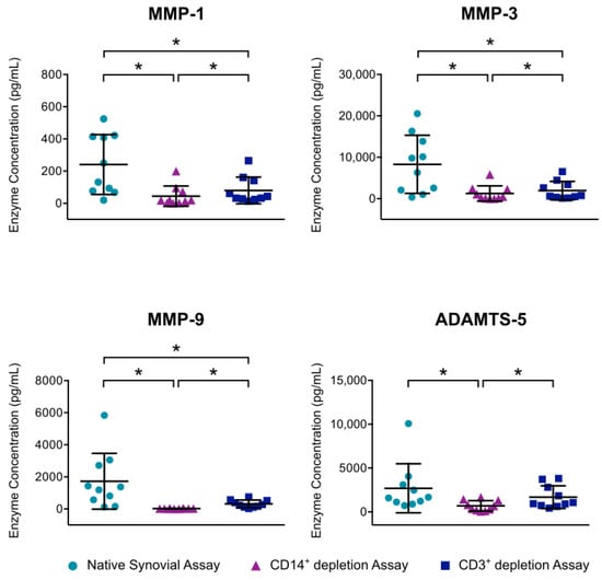 Effect of mononuclear cell depletion on MMP and ADAMTS production of synovial cell cultures is shown. After enzymatic digestion of synovial membrane from patients with advanced knee OA, depletion of CD14+ macrophages and CD3+ T cells was performed using magnetic activated cell sorting. Cells of native synovial assays and depletion assays were cultured for 12 h at 37 °C and 5% CO2. Enzyme linked immunosorbent assays were then used to analyze enzyme production in culture supernatants. Mean and standard deviation of enzyme concentrations of MMP-1/-3/-9 and ADAMTS-5 are plotted (n = 7). Significant differences are indicated by asterisks: * p < 0.05. In addition, production of MMP-13, ADAMTS-5 and ADAMTS-7 were analyzed, but concentrations were below detection level.