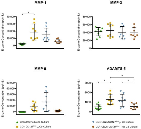 In order to investigate the interaction between mononuclear cells and chondrocytes, a series of co-culture experiments were set up and the enzyme release was assessed (Figure 6). Compared to chondrocyte monoculture, a significant increase of more than six-fold was detected for MMP-1 in chondrocyte co-culture with CD4+CD127dim/--enriched PBMC. The mean ADAMTS-5 concentration, which was 498 pg/mL in the chondrocyte monoculture, was also significantly increased to 1279 pg/mL in the chondrocyte co-culture with CD4+CD127dim/--enriched PBMC. The enzyme concentrations between the chondrocyte monoculture and the two chondrocyte co-cultures with Treg and Treg-depleted, CD4+CD25-CD127dim/--enriched PBMC showed no significant differences. However, all enzymes were detected in the Treg co-culture at lower concentrations compared to the other co-cultures, which was significant for ADAMTS-5. Furthermore, no significant differences in enzyme concentrations were shown between co-culture with CD4+CD127dim/--enriched PBMC (including Treg) and co-culture with Treg-depleted, CD4+CD25-CD127dim/- enriched-PBMC.