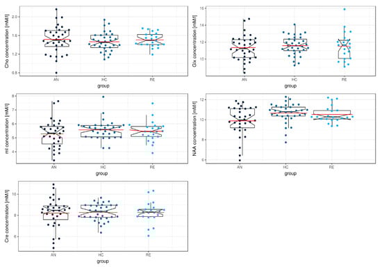 Boxplot of left insula metabolite concentrations across the anorexia nervosa (AN), healthy control (HC) and recovered group (RE). Red lines indicate mean metabolite concentrations.Abbreviations: Cho = choline; mI = myo-inositol; NAA = N-acetylaspartate; Glx = glutamate+glutamine; Cre = creatine.