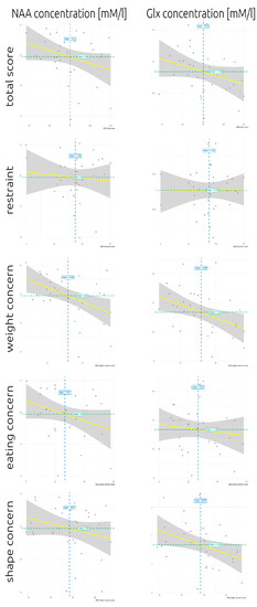 Our data indicated that lower NAA concentrations were associated with increased concerns about body weight (according to the EDE), which is a core feature of AN. The Glx signal showed a similar association with weight concerns and both NAA and Glx availability were important for glutamatergic neurotransmission [80,81]. Glx was also associated with shape concern, which did not survive the correction for multiple comparisons. Weight and shape concerns are central constructs of AN psychopathology and are part of a disturbed processing of body signals and integration of one’s own body perception. Weight concern refers to the importance of body weight, dissatisfaction with one’s own body weight, and the desire to lose weight as well as the preoccupation with shape and weight. Shape concerns imply feelings of fatness, fear of weight gain, and discomfort when looking at one’s own body (for further details see: [57,58]). Therefore, the lower the Glx and NAA levels are, the more serious are these concerns.