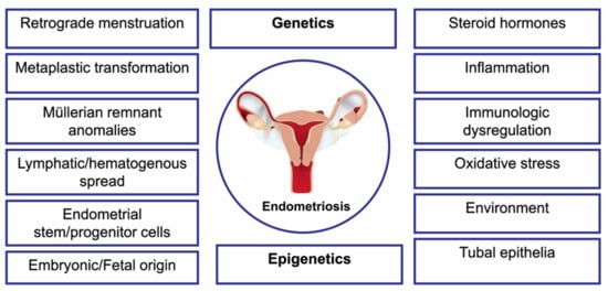 The cause of endometriosis remains unknown to date, and its complex etiopathogenesis has been only partially elucidated (Figure 1) [11,12]. Endometriosis is a multifactorial disease, generated by a combined action of multiple genetic, epigenetic, and environmental factors, all of them interacting with each other in order to yield the disease phenotype [13]. Previous genetic studies on endometriosis did not succeed in identification of the genetic variants strongly correlated with the risk of the disease. Nowadays, a better understanding of the genetic risk factors associated with endometriosis has been achieved owing to the use of advanced technological applications. Candidate gene studies, gene association and genome wide association studies (GWAS) have already yielded over 30 candidate genes [14]. However, studies aimed at determination of the usefulness of these genes for understanding the pathogenesis of endometriosis are still underway. To date, 27 independent single-nucleotide polymorphisms (SNPs) have been significantly associated with endometriosis upon GWAS, explaining over 5% of disease variances [15,16].