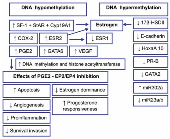 Research has indicated that the intrauterine environment altered due to endometriosis demonstrates abnormalities in DNA methylation, which causes a change in gene expression and progesterone resistance both in eutopic endometrial tissue and in the developing lesions [115,116]. Silencing of progesterone and aromatase genes through promoter hypermethylation may contribute to the development of endometriosis. In turn, targeting EP2 and EP4 receptors may be effective as a long term non-steroidal therapy for treatment of active endometriotic lesions.