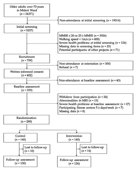 The present study was a secondary analysis of a 10-month single-blinded RCT of multicomponent exercise for older adults with global cognitive decline. The protocol for this trial (ID: UMIN000013097) was registered in the University Hospital Medical Information Network Clinical Trials Registry website (http://www.umin.ac.jp/ctr/index.htm). The main results of this trial are being prepared for submission as another manuscript. Several papers on the secondary analysis of this trial have already been published elsewhere [40,41]. The participants of the trial were recruited from a subcohort of the National Center for Geriatrics and Gerontology Study of Geriatric Syndromes (NCGG-SGS) [42], conducted in 2013 in Midori Ward of Nagoya city, Aichi Prefecture, Japan. A total of 24,271 individuals were invited to participate in the screening survey of physical and cognitive function; 5257 of these individuals participated. Of the 5257 participants, 709 were selected as potential participants after applying the following inclusion criteria: (1) scores between 21 and 24 at screening on the Mini-Mental State Examination (MMSE) reflecting global cognitive decline [43]; (2) did not have severe health problems including dementia, stroke, depression, and Parkinson’s disease; (3) normal gait speed ≥1 m/s; and (4) were not enrolled in other intervention studies. Recruitment documents were sent to the 709 individuals selected, and 359 participated in the baseline assessment. Additionally, after baseline assessment, 79 individuals were excluded who (1) withdrew from participation; (2) had abnormalities in magnetic resonance imaging (MRI); (3) were newly diagnosed with dementia, stroke, depression, or Parkinson’s disease; (4) attended fitness centers for more than 5 days per week; and (5) had missing data. Finally, 280 participants were assigned to either the intervention or control group using a computerized randomization scheme with a 1:1 ratio by a researcher blind to the study aims (Figure 1).