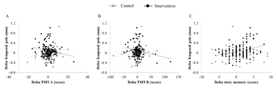 Relationship between changes in cortical thickness of the left temporal pole and cognitive performance: The change in thickness in the left temporal pole is plotted against change in cognitive performance (A) TMT-A, (B) TMT-B, and (C) story memory. Observations from the control group are triangles, and the regression line is dashed. Observation from the intervention group are circles, and the regression line is linear. TMT: trail making test.