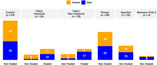 Blood samples were collected from patients with a confirmed Fabry diagnosis retrieved from the French Fabry cohort (FFABRY) using enzymatic test, genetic test, or both. FFABRY is a French multicenter cohort of patients with an enzymatic and/or genetic diagnosis of FD [44]. Sixty-nine patients were included: 34 with classical phenotype including 20 females (age range: from 20.2 to 75.4 years, mean age: 48.2 years) and 14 males (age range: from 20.2 to 59.4 years, mean age: 38.9 years), 35 with non-classic phenotype including 15 females (age range: 16.7 to 66.3 years, mean age: 45.9 years) and 20 males (age range: 17.1 to 74.2 years, mean age: 48.7 years). Forty-six were treated, 12 with Agalsidase α (nine classical and three non-classical), 21 with Agalsidase β (10 classical and 11 non-classical), one with Migalastat (non-classical), 10 with Agalsidase α and Agalsidase β (four classical and six non-classical), one with Agalsidase α and Migalastat (non-classical), and one with all three, i.e., Agalsidase β, Agalsidase α, and Migalastat (non-classical). The mean cumulative treatment duration time was 6.4 years. Genotyping was done in 63 patients out of 69. Twelve and 25 missense variants were found in classical and non-classical Fabry patients, respectively. For mutations leading to a truncated protein (deletion, frameshift, or non-sense mutations), 17 and nine were found in classical and non-classical Fabry patients, respectively. A summary overview of the clinical characteristics, phenotype, treatment, laboratory investigations, and GLA genotype of Fabry patients is presented in Table 1. The full data are presented in Tables S1 and S2 (Supplementary Materials). Human controls were selected with similar mean age and sex with no significant medical conditions. Control plasmas were purchased from Biovit (West Sussex, UK). We analyzed plasma samples from 83 healthy donors, 39 males (ages range: from 20 to 64 years, mean age: 39 years) and 44 females (age range: from 21 to 69 years, mean age: 44 years). To test our findings, we also collected other LD samples including 59 Pompe, 18 Niemann–Pick type C, and 30 Gaucher disease (GD). The overall summary of the cohort is presented in Figure 1. GD Patient samples were taken from the national multi-center GD biological collection (ELODIE-MG, #DC-2012-1652), with the agreement of the French GD expert group (Comité d’Evaluation du Traitement de la maladie de Gaucher, CETG) as the Scientific Committee. The study was approved by the Institutional Ethics Committee Research (Ethics Board of Rouen University Hospital - CERNI E2016-21).