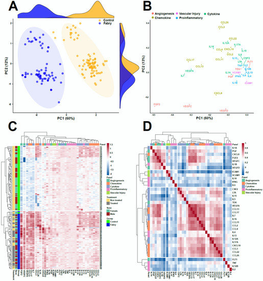 (A) Principal component analysis (PCA) score plot showing a clear separation between controls and Fabry samples. (B) PCA loadings showing the underlying proteins that drive this separation, mainly FGF2, IL-7, and VEGF. (C) Hierarchical cluster analysis of plasma samples based on protein levels. Classes are represented along the y-axis. The color code was used to represent log-scaled intensities of the proteins, showing the relative abundance of the protein according to the groups. The figure shows clear clustering. (D) Correlation heatmap between the assessed proteins and their hierarchical cluster analysis highlighting four main clusters. Low correlation is shown in blue and high correlation is shown in red.