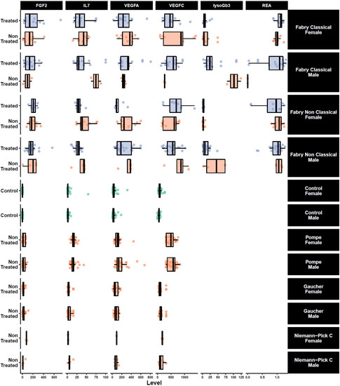 As illustrated in Figure 4 and Table 2, there is no significant difference in FGF2 and IL-7 concentrations between treated and non-treated Fabry patients. However, the relatively small number of included Fabry patients treated versus untreated patients, the heterogeneity of the given specific treatments, and the variability in the duration of treatment do not allow the accurate assessment of the treatment effect on FGF2 and IL-7 plasma concentrations. It can be assumed that this effect might depend on the treatment type and the pathways involved for its processing and action. For instance, it was recently reported that neutralizing antibodies toward exogenous enzyme may inhibit endothelial internalization and reduce enzyme activity [44,63]. Thus, plasma variations of a potential endothelial biomarker may depend on the expression of neutralizing antibodies in patients treated with ERT.