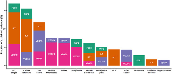 Barplot of variance explanation fraction of FGF2, IL-7, VEGFA, VEGFC, and related clinical characteristics. Colors are related to each protein. CKD; chronic kidney disease. HCM; hypertrophic cardiomyopathy. FGF2; fibroblast growth factor 2, IL7; interleukin 7, VEGFA; vascular endothelial growth factor A, VEGFC; vascular endothelial growth factor C.