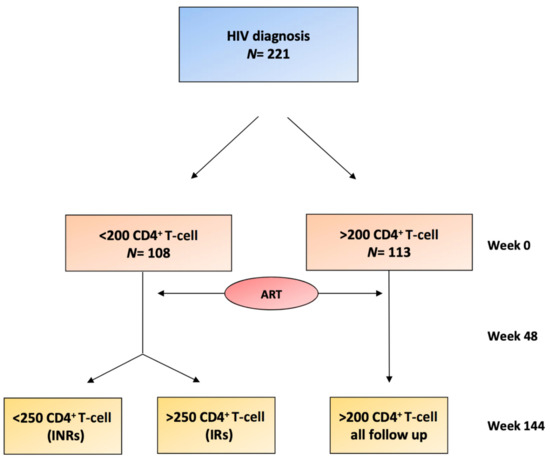 Flowchart of the patients included in the study. At week 0, the two groups were differentiated depending on the levels of CD4+ T-cells (<200 CD4+ T-cells or >200 CD4+ T-cells). Antiretroviral therapy (ART) therapy was initiated with subsequent follow-up at 48 weeks and at 144 weeks. At 144 weeks, two groups (IRs and INRs) were differentiated within the <200 CD4+ T-cell baseline group, depending on whether they achieved >250 CD4+ T-cells at week 144. INRs, immunological nonresponders; IRs, immunological responders.