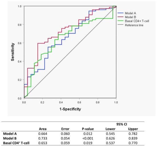 Receiver-operating characteristic curves (ROC) curves of Model A (blue) and Model B (red) for evaluating glycoprotein biomarkers as predictors of the immunological response to ART at baseline. Model A: Area GlycA, Area GlycB, height/width (H/W) GlycA and H/W GlycB. Model B: Model A, basal CD4+ T-cell count and age.