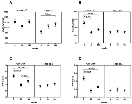 Higher levels of glycoproteins at baseline were significantly associated with the <200 CD4+ T-cells/µL group in comparison with the >200 CD4+ T-cells/µL group. Differences in the concentrations and H/W ratios of the glycoproteins remained significant after adjusting for age, FA, GGT, and VL (Table 1). Random forest analysis revealed that baseline H/W GlycA and H/W GlycB were the parameters that best classified the patients in these two groups (Supplemental Materials Figure S1).