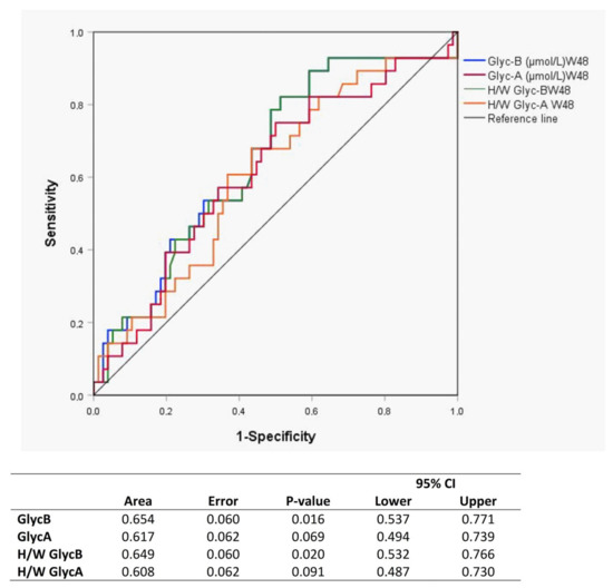 In the <200 CD4+ T-cells/µL group, the GlycB concentrations and H/W ratios showed a significant decrease at week 48, and the level was maintained up to week 144 (Figure 3B,D). The GlycA evolution showed a similar trend, although only the H/W ratio achieved statistical significance (Figure 3A,C). This pattern was not observed in the >200 CD4+ T-cells/µL group. The ROC curves including GlycB and its H/W ratio separately at week 48 show a predictive value of immunological response (Figure 4).