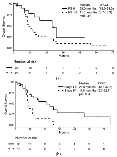 During a median follow-up of 29.0 months (95% CI 9.9–48.1), 32 patients had died for a median OS of 16.0 months (95% CI: 10.3–21.7, Supplementary Figure S1). Median OS was significantly longer in patients with PS 0 compared to those with poorer PS (28.0 months (95%CI: 18.0–38.0) vs. 11.0 months (95% CI: 8.7–13.3), respectively; p = 0.041, Figure 1a) and in those with stage I–III compared to those with stage IV at diagnosis (25.0 months (95% CI: 12.8–37.2) vs. 11.0 months (95% CI: 9.3–12.7), respectively; p = 0.004, Figure 1b).