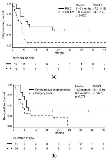 Characteristics of the 37 patients who received upfront treatment with curative intent are summarized in Supplementary Table S1. Of these, BNEC relapsed in 26 patients (70.3%) for a median RFS of 7.0 months (95% CI: 4.6–9.4) and a median OS of 28.0 months (95% CI: 12.7–43.3) (Supplementary Figure S2). RFS was significantly longer in patients with PS 0 compared to those with poorer PS (11.0 months (95% CI: 7.5–14.5) vs. 6.0 months (95% CI: 4.3–7.7), respectively; p = 0.030, Figure 2a). The RFS difference by perioperative chemotherapy administration did not reach statistical significance despite the RFS being numerically longer in patients who received perioperative chemotherapy compared to those receiving surgery alone (11 months (95% CI: 8.1–13.9) vs. 6 months (95% CI: 5.2–6.8), respectively; p = 0.078, Figure 2b).