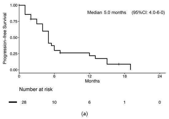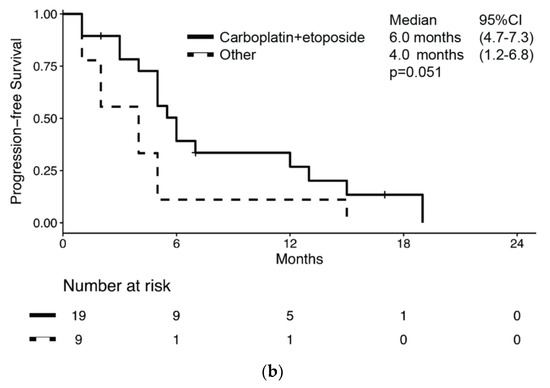 Overall, 28 patients (28/51, 54.9%) received chemotherapy for metastatic BNEC (Supplementary Table S2). Of these, 15 had disease relapse after previous radical surgery, while 12 had metastatic disease at diagnosis. One patient started chemotherapy for inoperable stage III BNEC. Median PFS and survival from chemotherapy start was 5.0 months (95% CI: 4.0–6.0) (Figure 3a) and 8.0 months (95% CI: 7.1–8.9), respectively. Median PFS was numerically longer in patients receiving carboplatin-etoposide chemotherapy compared to patients receiving other regimens, but without reaching statistical significance (6.0 months (95% CI: 4.7–7.3) vs. 4.0 months (95% CI: 1.2–6.8); p = 0.051, Figure 3b).