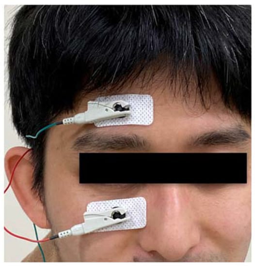 Detailed plans of the treatment session have been published elsewhere [17]. Over a 10-week period, participants received six sessions of SES, with one session every 2 weeks. To generate SES, the Mayo corporation (Aichi, Japan) provided the non-approved medical instrument used in this study, which monitored the electrical current being applied to the body and prevented excessive electrical stimulation. For the intervention, two electrode pads were placed on the skin around an eye, one on the forehead above the eyebrow and the other below the margin of the lower lid (Figure 1). If participants had any visual function, we judged that they noticed phosphene elicited by the SES procedure. The minimum current at which a participant perceived phosphene throughout the entire visual field was designated as a threshold current and was applied to that participant during SES treatment. The participant was then treated with the following SES protocol for 30 min: biphasic square wave, 1 mA amplitude, 10 ms duration, and 20 Hz frequency. In cases where the phosphene threshold exceeded 1 mA, the maximum current of 1 mA was applied for the sake of safety. The investigator monitored reactions of participants during SES.