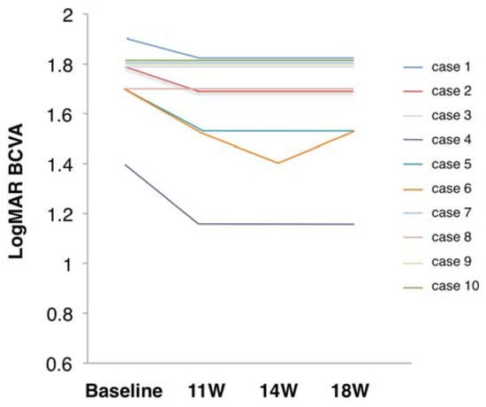 Changes in visual acuity from before to after skin electrical stimulation. LogMAR BCVA, logarithm of minimal angle resolution-converted best-corrected decimal visual acuity. Courses of individual cases.