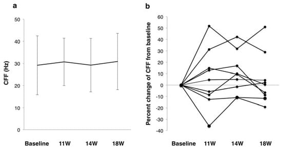 Concerning the CFF, there were no significant differences from baseline to any follow-up after SES (Figure 3a). However, four cases exhibited increased CFF from baseline to one week of follow-up: two showed increases >20%, and another two showed increases of 10–20% (Figure 3b). Over time, the cases with a CFF increase of 10–20% returned to the baseline level. Another case showed no significant changes in CFF during follow-up, and the remaining five cases actually showed decreased CFF values.