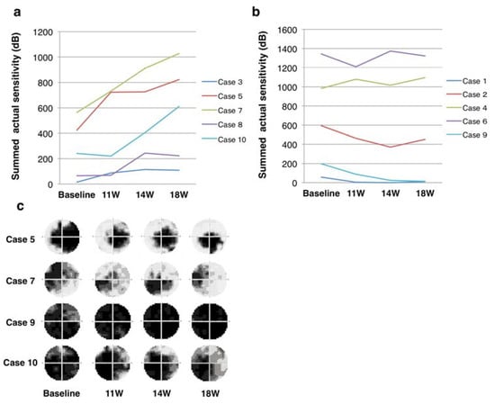 Time course of changes in summed actual sensitivity at 52 test points (except outermost points). (a) the effective group showing the increase of summed actual sensitivity compared with baseline; and (b) ineffective group showing no improvement. (c) The Humphrey visual field grayscale in four representative cases that had improved visual fields (Cases 5, 7, and 10) and deterioration of visual field (Case 9).