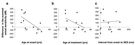 To further identify factors associated with the visual field changes, we evaluated the correlation between the difference in the summed actual sensitivity between baseline and at 18 weeks with age at onset (Figure 5a), age at treatment (Figure 5b), and interval between the disease onset and SES (Figure 5c). The change in the summed sensitivity had a significant correlation with age at onset (r = −0.67, p = 0.03), whereas it did not with age at treatment (r = −0.46, p = 0.18) or the duration between disease onset and SES (r = 0.06, p = 0.86). This suggests that the younger is the patient at onset, the more effective is SES, irrespective of the interval between disease onset and SES initiation.