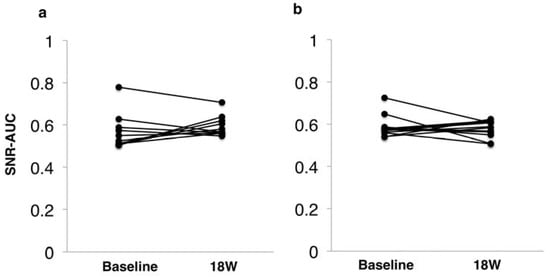 Regarding the mfVEP, we used the SNR-AUC (range, 0.5–1.0) as an index analogous to the total deviation of the HVF test. An SNR-AUC value of 0.5 indicated that there was no significant signal, whereas a value of 1.0 indicated that the whole stimulated sector has significant signals. We previously showed that this corresponded well to glaucomatous visual field changes [20]. The median of SNR-AUC in 60 recording sectors was 0.54 (0.51–0.60) at baseline and 0.57 (0.56–0.62) at eight weeks after the last SES session (p = 0.33; Figure 6a). Similarly, the average SNR-AUC in the central 36 recording sectors was 0.57 (0.55–0.60) at baseline and 0.58 (0.54–0.61) at eight weeks (p = 0.54; Figure 6b). Thus, SNR-AUC in both 60 recording sectors and central 36 recording sectors were not significantly increased compared with the baseline. Table 3 lists the summary of changes in visual function parameters tested. In other words, four cases showed BCVA improvement, two cases CFF improvement, and five cases VF sensitivity improvement, whereas no case exhibited BCVA deterioration, one case VF CFF deterioration, and one case VF sensitivity deterioration. Regarding color vision and central visual sensitivity detected by MP-3 microperimetry, neither could be performed because of the severe central visual field defect (data not shown).
