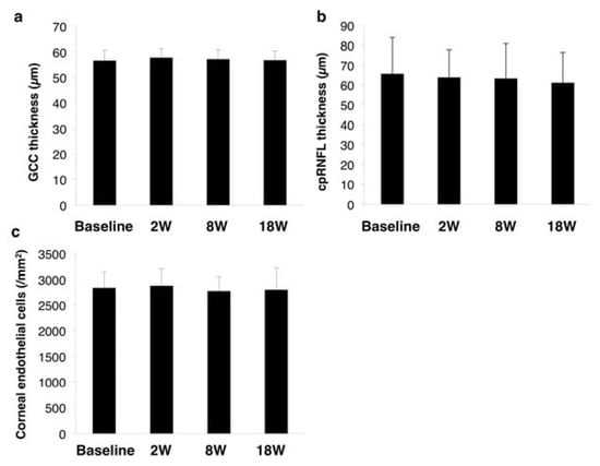 All SES sessions were completed in all 10 cases. None expressed tolerability issues relating to the electrical stimulation. We also observed no local keratitis, dermatitis, anterior ocular segment inflammation, optic media opacity, fundal abnormalities, facial and trigeminal nerve abnormalities, and nasal abnormalities. There were also no issues with the electrical stimulation device during the trial. However, to evaluate the safety of SES on the retina, we measured the thicknesses of the GCC (Figure 7a) and the cpRNFL (Figure 7b). There were no significant changes in either parameter from baseline to eight weeks after the last SES session (GCC: a mixed effect model; F value = 2.30, p = 0.13 cpRNFL: F value = 1.46, p = 0.27) (Figure 7a,b). Corneal endothelial cells did not significantly reduce from baseline to eight weeks after the last session of SES (F value = 0.50, p = 0.69) (Figure 7c).