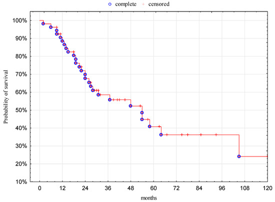 In our analysis, the percentage of LCNEC patients without recurrence after three and five years was 41% and 31%, respectively. Similar results were obtained by other authors, such that 3- and 5-year recurrence-free survival was reported in 45% and 38–39.3% of patients, respectively [3,30,34]. Many recurrent tumors as distant metastases were observed in LCNEC patients with complete resection [20,21,37]. Therefore, surgery alone could be insufficient to treat patients with LCNEC and adjuvant therapy may be necessary [36,38]. In our analysis half of the patients were treated with surgery alone and 42% of patients were treated with adjuvant chemotherapy. Some authors [6,7,39] reported that postoperative adjuvant chemotherapy was effective in patients with LCNEC. Sarkaria et al. [20] reported a high response rate to neoadjuvant chemotherapy of LCNEC patients and that resected advanced-stage patients receiving a combination of neoadjuvant and/or adjuvant chemotherapy may have a survival advantage. Iyoda et al. [21] noted that 50% of LCNEC patients after surgery had confirmed recurrent tumors upon follow-up examinations and most of them within three years. The authors also noted that patients who underwent platinum-based adjuvant chemotherapy had a significantly lower rate of tumor recurrence and a higher rate of disease-free survival than those who had non–platinum-based adjuvant chemotherapy or no adjuvant chemotherapy. Raman et al. [26] showed that perioperative chemotherapy was associated with improved survival for pathologic stage II–IIIA disease. In our multivariate analysis, next to age >64 years (p = 0.04), surgery alone (p = 0.02) was found to be associated with an increased risk of death. Generally, neo- or adjuvant therapy could be the most important predictor of better OS, as most older patients were treated with alone surgery (59%) compared to younger patients, who received neo- or adjuvant therapy (69%); this difference was statistically significant (p = 0.04). Other authors [3,29] confirm older age as an adverse indicator for survival outcomes of LCNEC patients who underwent surgery. In China, authors provide a multivariate model of predictors of overall survival in pulmonary large-cell neuroendocrine carcinoma and determined that age at diagnosis, gender, tumor stage, N stage, tumor size, and primary site of surgery were independent prognostic factors influencing OS [40]. In a multivariate analysis conducted by Sarkaria and colleagues [20] male gender, advanced-stage at diagnosis, and pulmonary comorbidities remained significant predictors of worse survival.