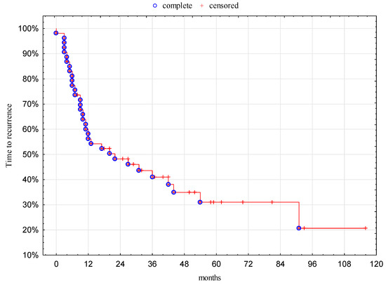 The median time to recurrence was 20 months (95% CI: 7.0–75.6 months) and 1-, 3-, and 5-year TTR was 58%, 41%, and 31%, respectively (Figure 2).