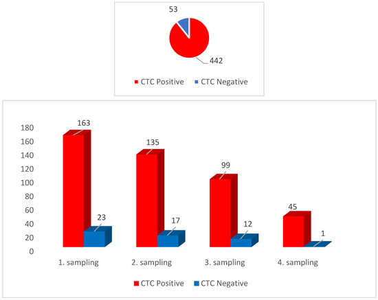 Circulating tumor cells (CTCs) detected in renal cell cancer (RCC) patients for one-year follow-up in four blood samplings. All together 495 samples (in duplicates) were evaluated, with an average 86.6% CTC positivity rate.