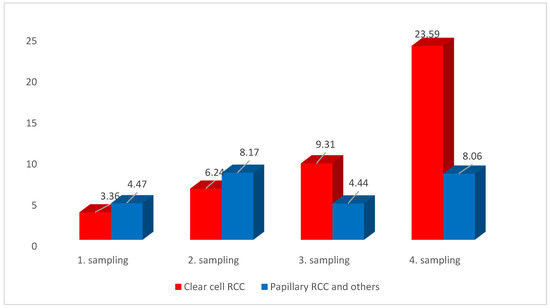 CTC—number (average per 1 mL of blood) detected in RCC patients for one-year follow-up in four blood samplings showing differences in CTC load between ccRCC and other RC types.