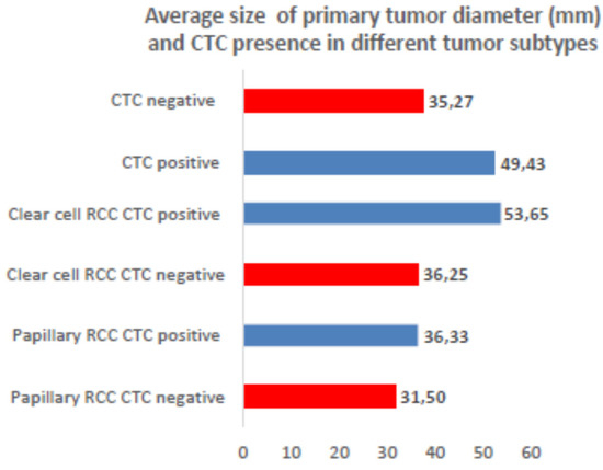 The average CTCs size for the groups of ccRCC is 24 ± 6.3, the average CTCs size for the group of papillary renal cell cancer (pRCC) is 22 ± 3.4, and for the other types is 27 ± 3.7 µm.