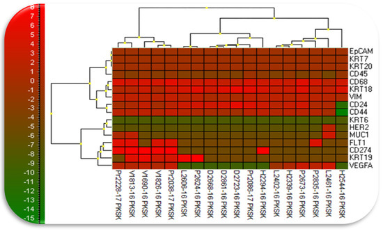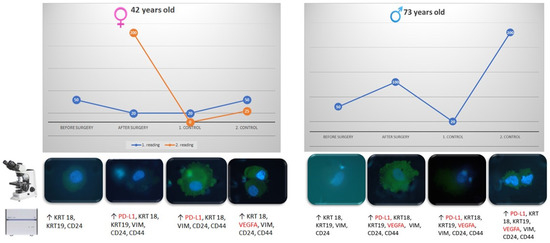 Gene expression analysis revealed elevated gene expression in enriched CTCs for genes KRT18 (keratin 18), VIM (vimentin) when compared with the white blood cell fraction (Figure 5). Further, it showed that the character of CTCs undergoes changes during follow-up period (Figure 6). From the therapeutic point of view the most interesting changes were seen in patients expressing elevated VEGF (vascular endothelial growth factor) and/or PD-L1 (programmed death ligand 1, CD274) on CTCs. VEGF and PD-L1 are shown on follow-up figures (Figure 5 below the graphs and Figure 7).