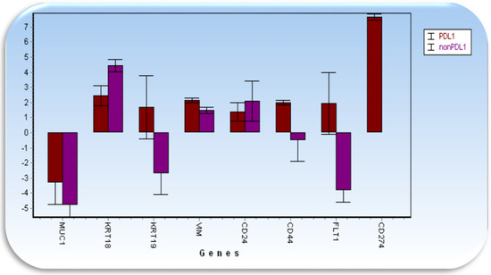Gene expression analysis of CTC showing differences between the CTC PDL1+ (brown) and CTC PDL1- (violet). The arrows indicate genes expressed differentially between tested groups.