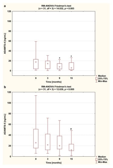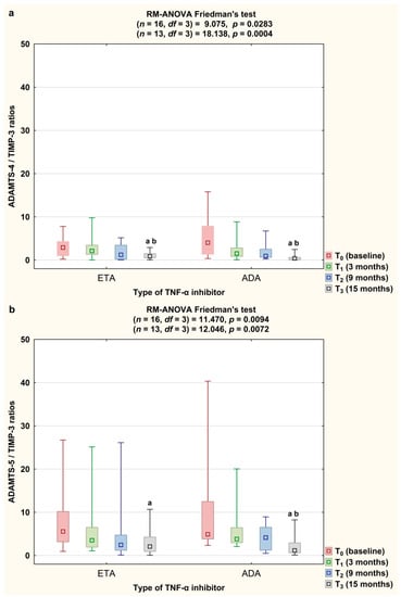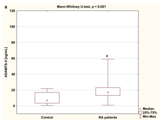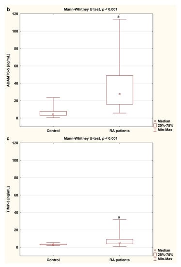- Tsuzaka, K.; Itami, Y.; Takeuchi, T.; Shinozaki, N.; Morishita, T. ADAMTS5 is a biomarker for prediction of response to infliximab in patients with rheumatoid arthritis. J. Rheumatol. 2010, 37, 1454–1460. [Google Scholar] [CrossRef]