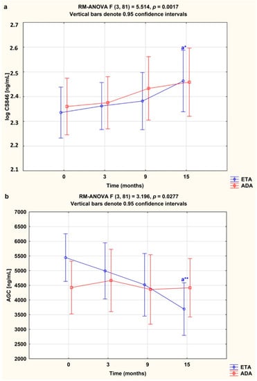 3.4. Serum Concentrations of CS846 and AGC and ADAMTS/TIMP-3 Ratios Depending on the Type of TNF-α Inhibitor Used