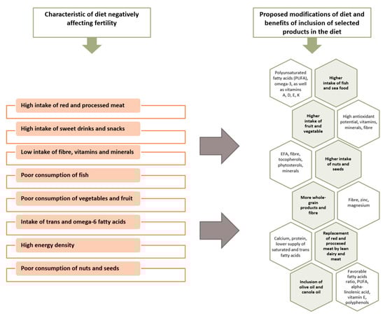 Characteristics of a diet negatively affecting fertility and its proposed modifications. [6,7,31].