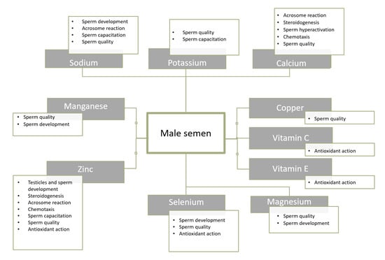 It is also recommended to provide an adequate supply of magnesium and calcium. The former constitutes a key element in the course of spermatogenesis and sperm motility, and also in the female reproductive tract. Furthermore, calcium affects the motility, hyperactivation, and capitulation of sperm and ultimately, the acrosome reaction, leading to sperm penetration into the oocyte [81]. In addition, copper is also necessary for the proper functioning of sperm and manganese affects the motility of sperm and the fertilization process [124,125,126,127]. Nevertheless, both manganese and copper in excessive amounts show an adverse effect on sperm [128,129]. The knowledge about the impact of selected trace elements and vitamins on male semen is summarized in Figure 3.
