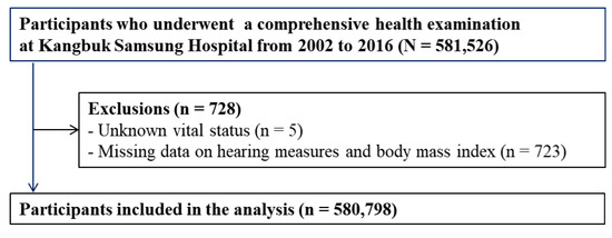 Therefore, we examined whether HL is associated with overall, cardiovascular, and injury-related mortality in a large-scale cohort study of 580,798 Korean adults who attended a health check-up program. The study accounts for change in HL, cardiovascular risk factors, and other covariates during follow-up.