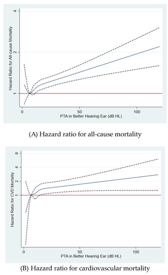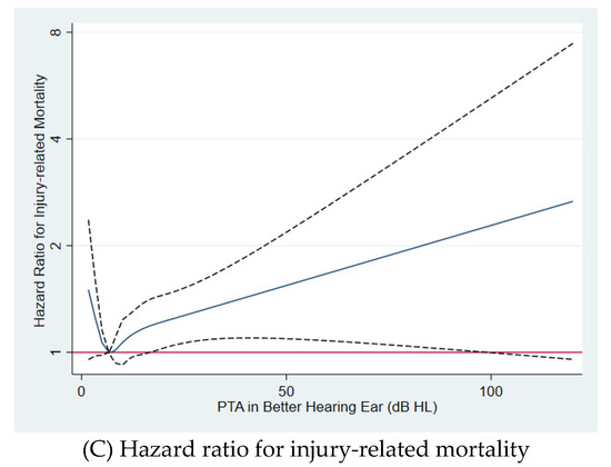 Multivariable-adjusted hazard ratios for (A) all-cause, (B) cardiovascular disease, and (C) injury-related mortality by hearing level. Estimates were adjusted by age (timescale), sex, center, year of screening exam, smoking status, alcohol intake, regular exercise, BMI, education level, exposure to occupational noise, history of diabetes, history of hypertension, history of cancer, history of cardiovascular disease, and medication for dyslipidemia. The solid line represents relative hazard, and the dashed lines represent the confidence intervals for the spline model. The horizontal red line corresponds to the normal reference hazard ratio of 1.0. dB, decibels; HL, hearing level; PTA, pure-tone average.