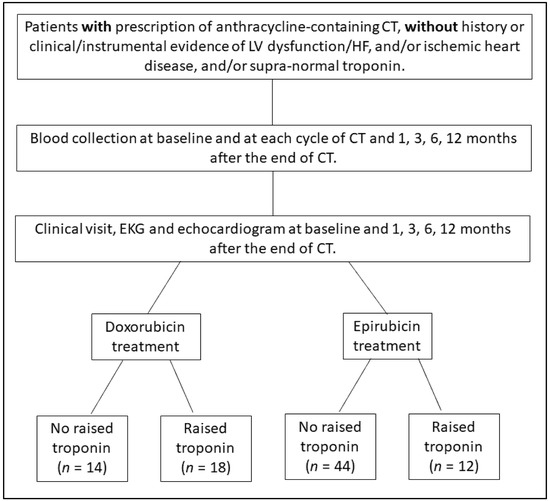 Since troponins were assayed in local laboratories with commercial reagents measuring different subunits (I or T) with different sensitivities, troponin levels were normalized to the local upper limits of normal (ULN) and expressed as a binary variable, higher (>, cTn+) or lower (≤, cTn−) than the local ULN. All data about troponins are presented in Table S1. Troponin was assessed at baseline, at each anthracycline cycle and 1, 3, 6 and 12 months after the completion of chemotherapy (CT).